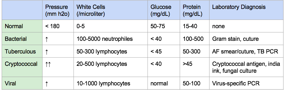 另外,除了腦脊隨液的培養外,腦脊隨液的分析則是可以提供腦脊隨液中是否有病原菌的資訊,這些資訊包含腦脊隨液的壓力、白血球量、葡萄糖、蛋白質。