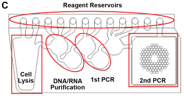 其實這技術已經很久了,就是Multiplex Nested PCR,只是如何整合成一個儀器,就是一門學問了,其中採用了流道的設計思維,將多個反應穿接在一起,但又能保有各自獨立的反應空間。
