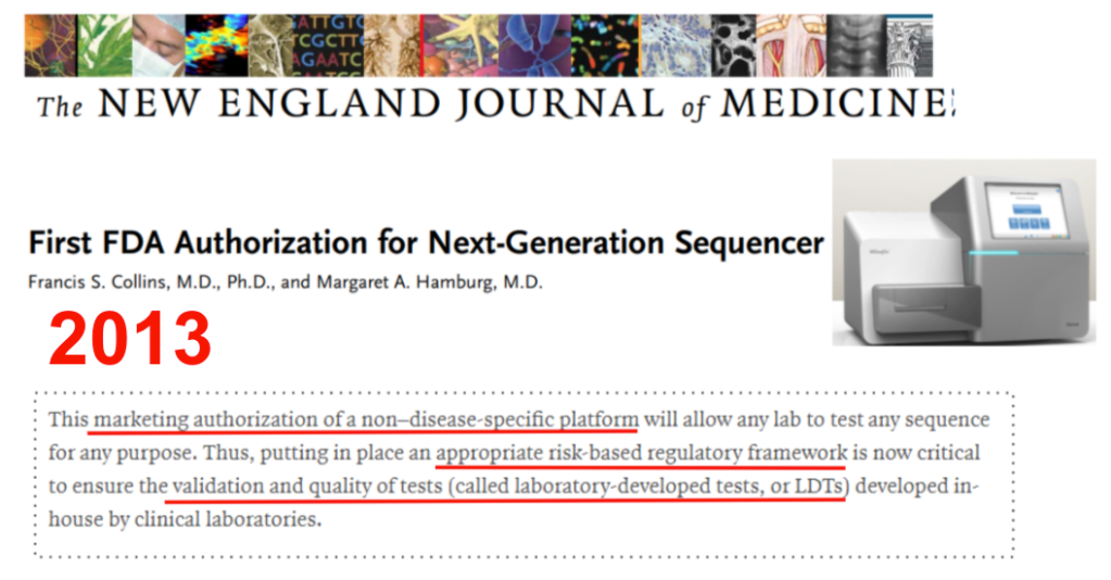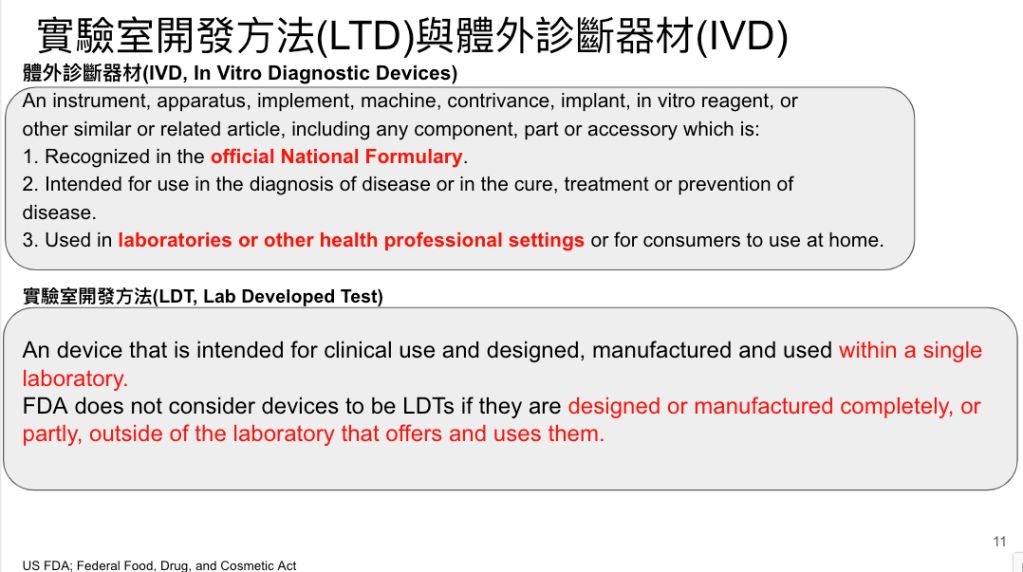 而後續產業界跟學術界慢慢希望可以用實驗室開發方法的法規來適用這類的法規,所謂的體外診斷器材(IVD, In Vitro diagnostic devices)和實驗室開發方法(Lab developed test)是有一些不太一樣的地方,實驗室開發方法通常是那些進步快速的領域之檢驗項目,因為變化太快速了,要是走IVD法規路線,可能核准完市場已經變化且技術同時已經落後,這部分在次世代定序領域尤為常見。