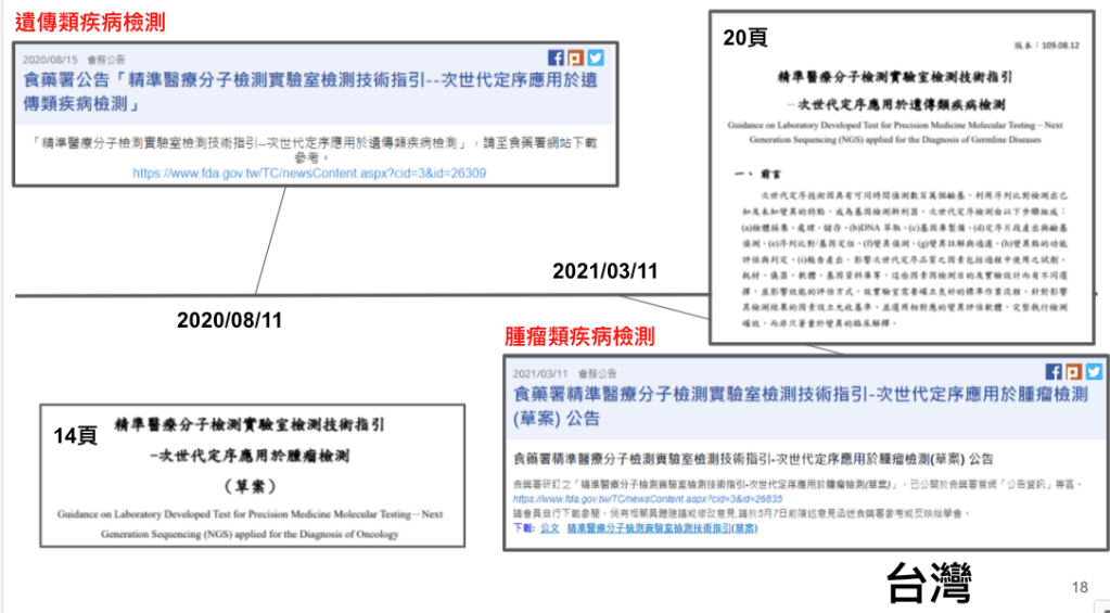 台灣這幾年政府也希望能回應醫療人員對於次世代導入臨床之需求,所以分別在2020年和今年年初都有分別針對遺傳類和腫瘤類的基因檢測給予相關的指引,這邊往下比較台灣指引在20200811年公告之精準醫療分子檢測實驗室檢測技術指引-是世代定序應用於遺傳類疾病檢測及20210311公告之精準醫療分子檢測實驗室檢測技術指引-是世代定序應用於腫瘤檢測(草案)。