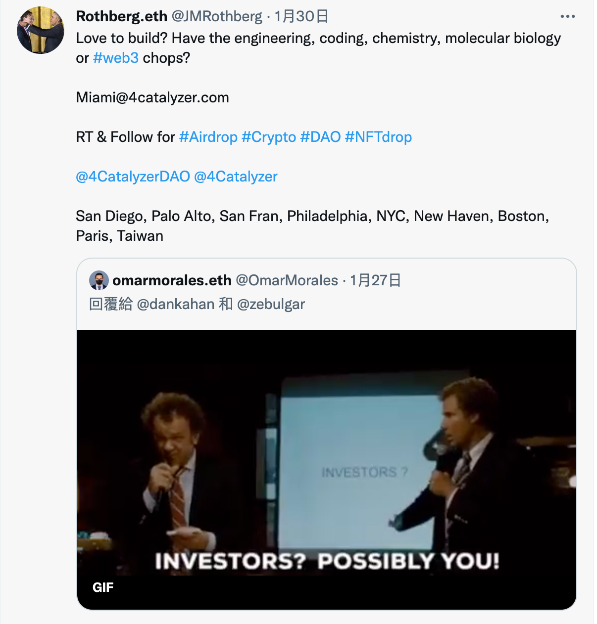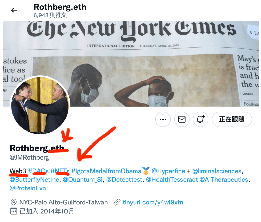 這邊有幾個有趣的地方,第一個是Rothberg購買了在以太坊上的網址並且放在他的Twitter名字上,這是常見參與區塊鏈領域的人之習慣,再來可以看到他的介紹上面有寫到Web3、DAO和NFT,因為對基因體領域的前輩多多少少都有追蹤,所以對其Twitter的變化也是很驚訝,但另一方面也是好奇這位生技前輩看到了什麼有趣的趨勢!