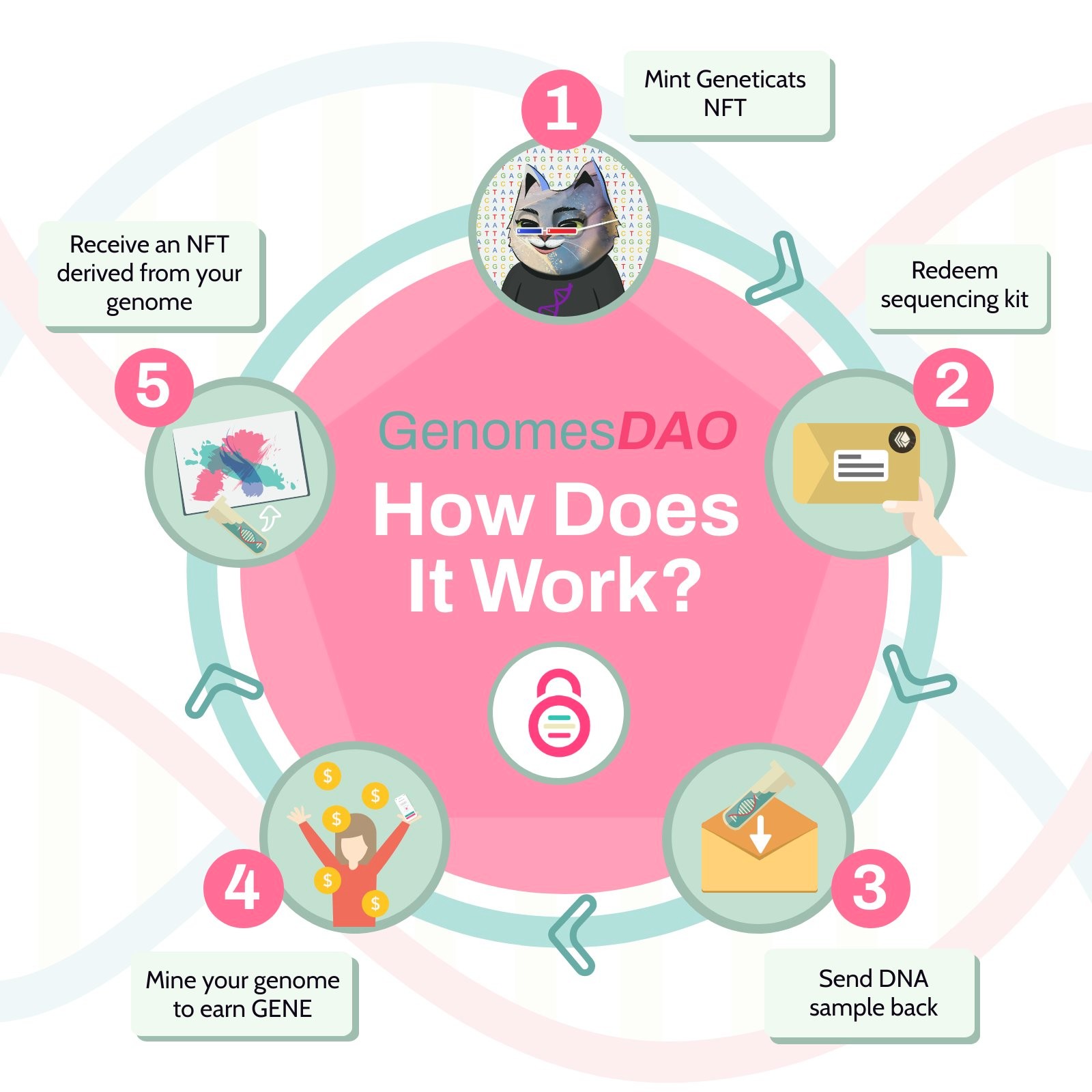 藉由購買或是鑄造一個Geneticats的NFT後,可以使用這個NFT來兌換實體的定序採檢套組,這個套組可以寄到世界各地,你只要用這個採檢棒刮取口腔中的粘膜,把一些細胞刮下來,再寄回去,經過約14-16周的檢體處理和定序,基因資訊會完成處理,將你的序列用AMD加密的方式儲存,此時便能利用你的資料來挖礦(售予藥廠、生技公司、研究機構使用你的資訊,並且給予你$GENE幣),同時可以使用你的資料再來鑄造成另外一個生成式的藝術作品。
