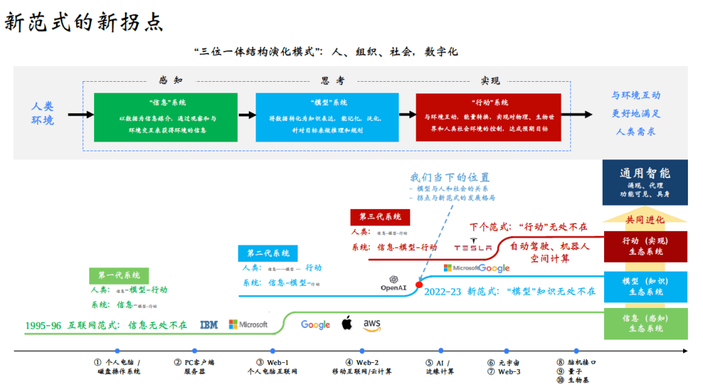 社會經濟的發展可以理解成,人、組織、社會和數字化對於人類環境所產生的系統,這系統有感知、思考和實現能力。 這次數位化的範式變更將直接驅動模型和行動體系,用數位化的能力去轉化能源,將被大步的往前躍進。 數位化是人的延伸,是人自我認知和能力的延伸。 有了數位化的能力之後,我們將持續不斷的去改造世界。 要改造世界,必須要轉換能源,並且將能源轉化為信息。能源轉化只有兩種形式,一種是用生命體系來轉化,另一種是用物理體系轉化能源。此外,能源轉化不需要必須要有物理空間,這次技術革命將更快的驅動現代的空間技術。最後,科技將不斷的加快社會的進步速度。所以這次的變革將在更大程度上讓更多的企業成為科技公司,技術將更快的驅動社會經濟發展。