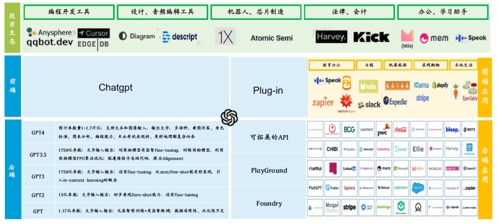 OpenAI產業生態,現在正在高速發展,其生態結構已經形成,因為它目前領先不少。它的平臺就是GPT,現在是GPT 4。OpenAI的後台開發出了新的模型,前臺是ChatGPT,它是一個人類歷史上從未有過的自然語言交互介面。 同時,它還有一個可擴展介面,就是ChatGPT Plugin,已經有大量的應用可以在這個平台上開發。人類歷史上從未有過自然語言交互的介面,比如ChatGPT。同時,ChatGPT也做了一個平臺的可延伸介面,即ChatGPT Plugin,已經有許多應用在此基礎上開發。OpenAI前後台每天都有大量的應用在被開放,OpenAI自己也有一個完整的生態佈局,通過投資以及與YC的關係驅動,生態的健康成長是當前最關鍵的,這是我想與大家分享最重要的資訊。在數位化產業的發展中,開發者的介面和生態是最重要的。