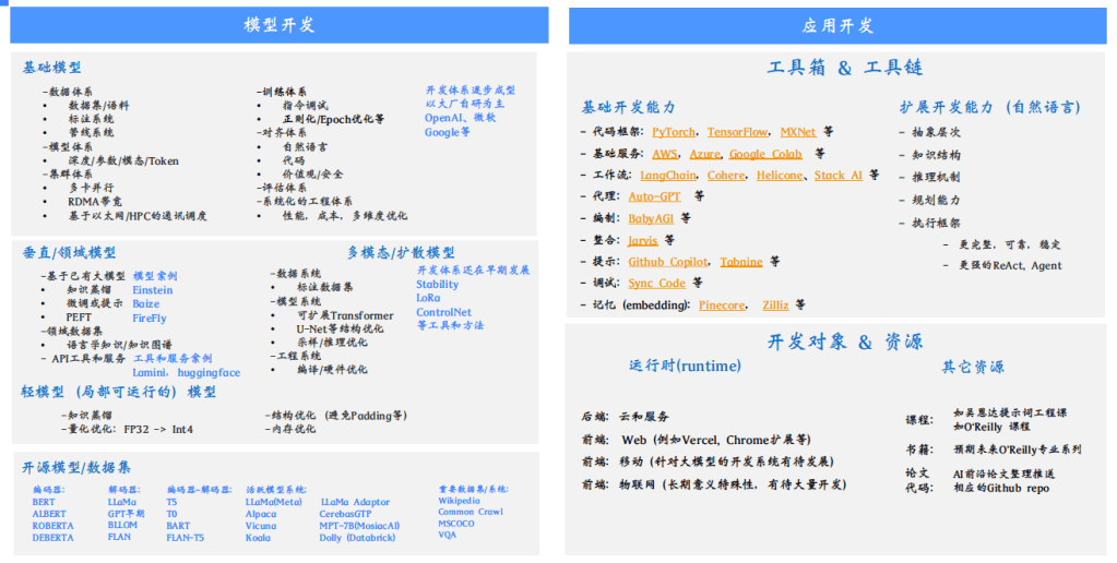 在模型開發方面,我們還在早期,但已有大量的進展。 大模型、領域模型、邊緣模型和開源模型都在同步開發,更重要的是,開發應用也在同步進行。 基礎開發代碼的工作流、代理機制提示調試和記憶embedding都需要我們關注,因為有大量的應用需要開發。