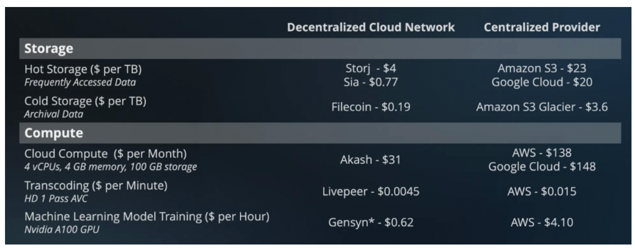 最核心的表其實就是下面這張雲服務和去中心化服務的價錢: