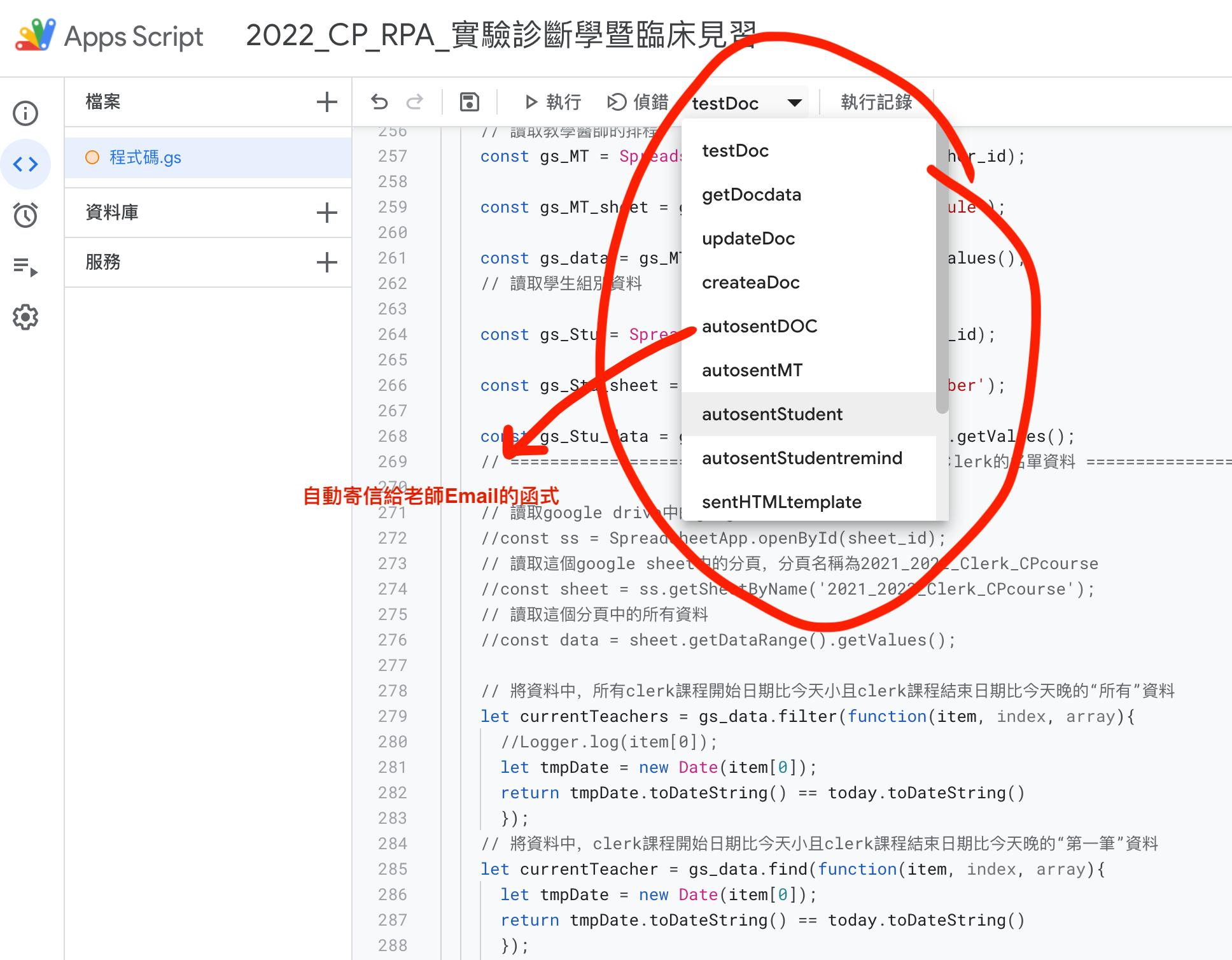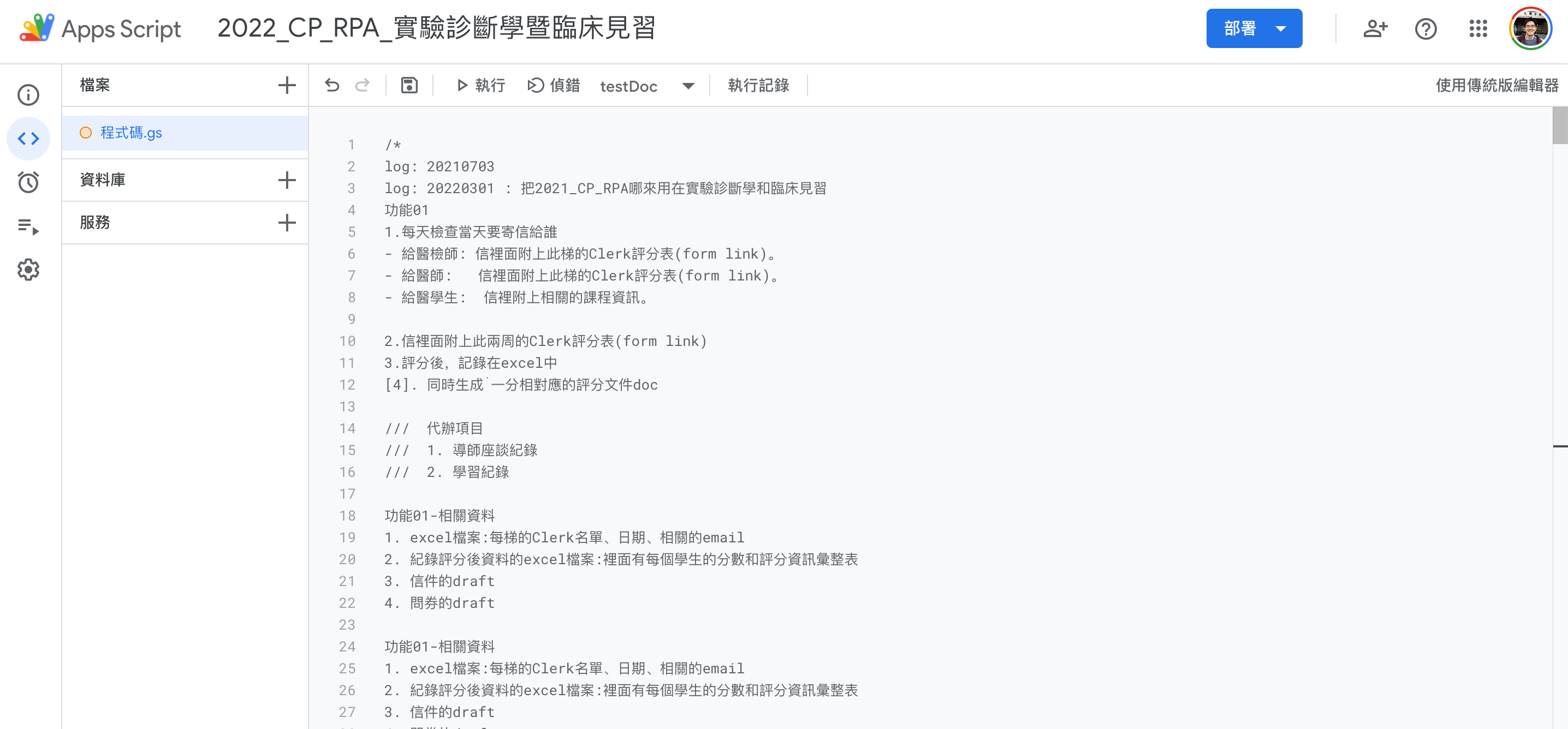 整個畫面就如同一個簡單的編輯器,裡面可以直接撰寫代碼來控制你的文件,主要是使用Javascript的語法,所以相對容易,你不用在自己學習新的語法和觀念,只需要搞懂Google App Scrip裡面調用Gmail, Google Sheet, Google Form的函式即可,以及你想要怎麼去串接資料來達成你想要的任務。